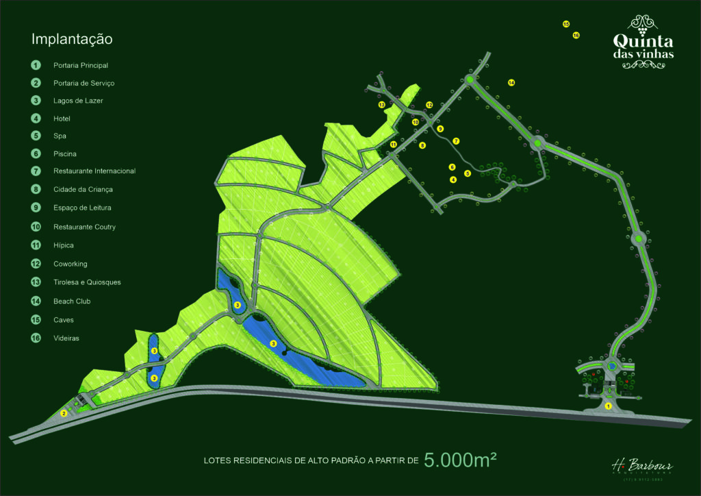 Na primeira fase, serão 1.500 lotes de 5.000 m², distribuídos em cinco etapas, que formarão um cenário de rara beleza e sofisticação. O empreendimento contará com pista de pouso para aviões de médio porte, hotel de luxo, restaurante internacional, spa, piscinas, hípica, lagos de lazere umaportaria social monumental — projetada como símbolo da elegância e da grandiosidade do empreendimento.